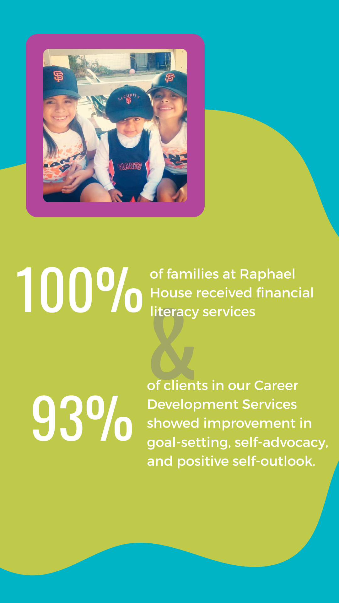 At Raphael House, we understand how loud the voices of doubt can be in our residents’ heads. That’s why 100% of families at Raphael House receive financial literacy services, including access to savings plans and career counseling. Last year alone, 93% of clients in our Career Development Services demonstrated improvement in goal-setting, self-advocacy, and positive self-outlook.